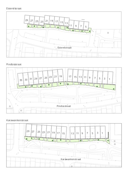 We hebben verschillende mogelijkheden onderzocht. Verkoop of verhuur van de grond is helaas niet mogelijk, vanwege de aanwezigheid van kabels, leidingen en huisaansluitingen. Ook is de ondergrond niet geschikt: er zit veel puin in, waardoor de grond eerst moet worden afgegraven. Daarom hebben we een aantal voorstellen uitgewerkt die makkelijk te onderhouden zijn, passen bij de uitstraling van de wijk en waar bewoners hun voorkeur voor kunnen aangeven.