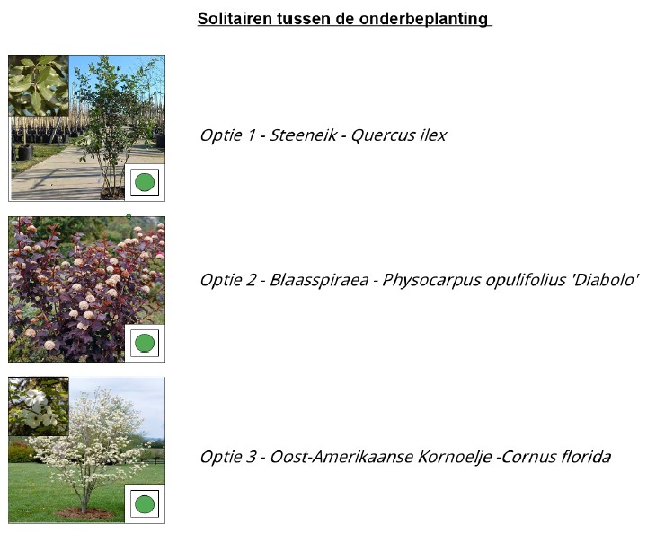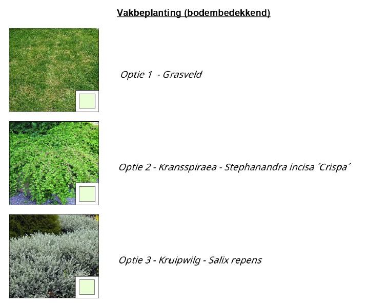 - foto’s van de twee soorten hoofdbeplanting en de drie soorten heesters.