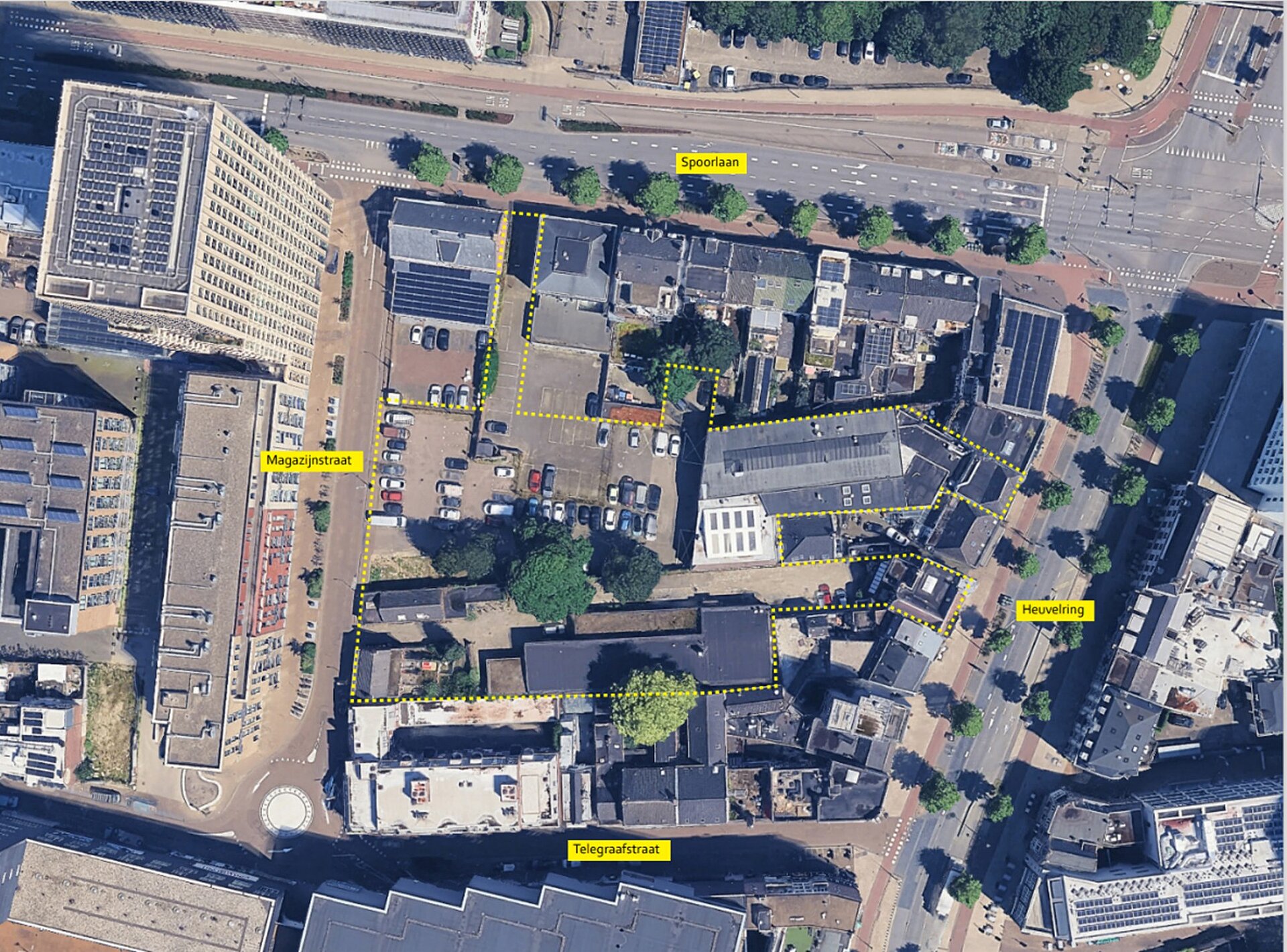 Op de luchtfoto hieronder ziet u het projectgebied Magazijnkwartier-Oost. Het ligt tussen de Spoorlaan, Magazijnstraat, Telegraafstraat en Heuvelring. Er staat een gele stippellijn omheen.