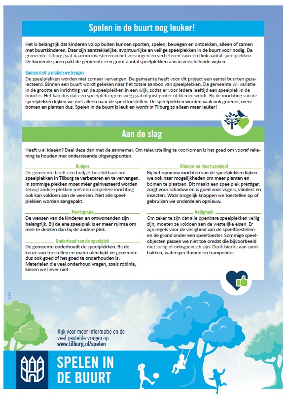 De gemeente Tilburg investeert de komende jaren in het vervangen en verbeteren van een groot aantal speelplekken in de stad. Namens de gemeente gaan wij ook aan de slag met het opknappen van de speelplek aan de Maalbergenstraat. Lees er meer over in deze brief. Samen met u maken we spelen in de buurt nóg leuker.