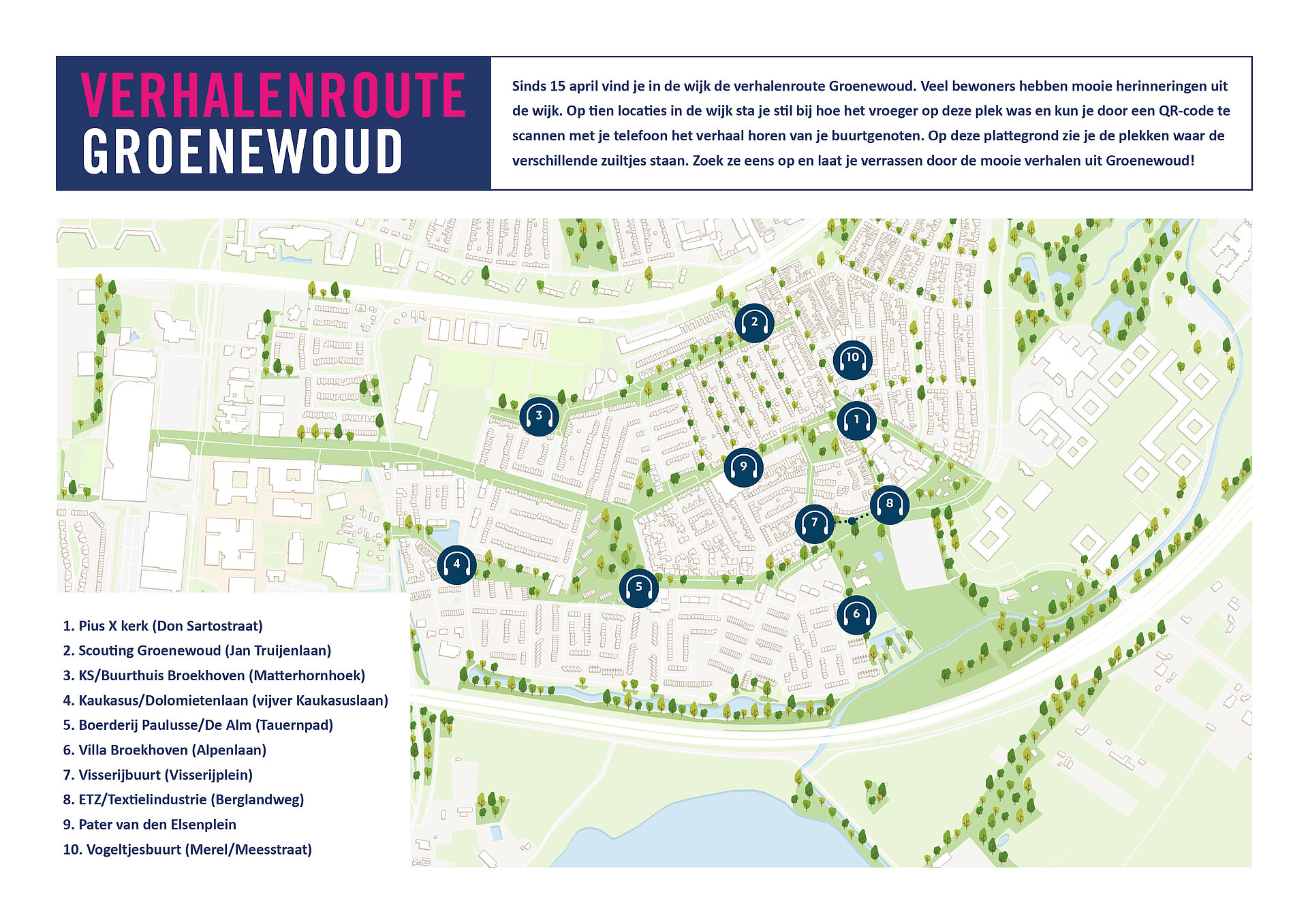 Sinds 15 april vind je in de wijk de verhalenroute Groenewoud. Veel bewoners hebben mooie herinneringen uit de wijk. Herinneringen aan de Pius X kerk, weetjes over straten en gebouwen, bijzondere vriendschappen tussen buurtbewoners en de oude sportkantine die nu een buurthuis wordt. Op tien locaties in de wijk sta je stil bij hoe het vroeger op deze plek was en kun je door een QR-code te scannen met je telefoon het verhaal horen van je buurtgenoten. Op deze plattegrond hieronder zie je de plekken waar de verschillende zuiltjes staan. Zoek ze eens op en laat je verrassen door de mooie verhalen uit Groenewoud.