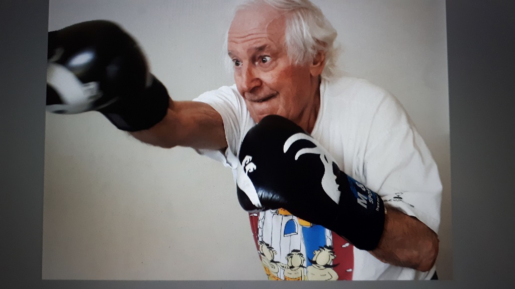 Sinds augustus 2023 hebben we allebei een abonnement bij SmileStone. Daar doen we twee keer per week cognitief/motorische oefeningen in een groepje van ongeveer tien personen die allemaal wel wat mankeren. En ik mag regelmatig een potje boksen met een van de trainers.”