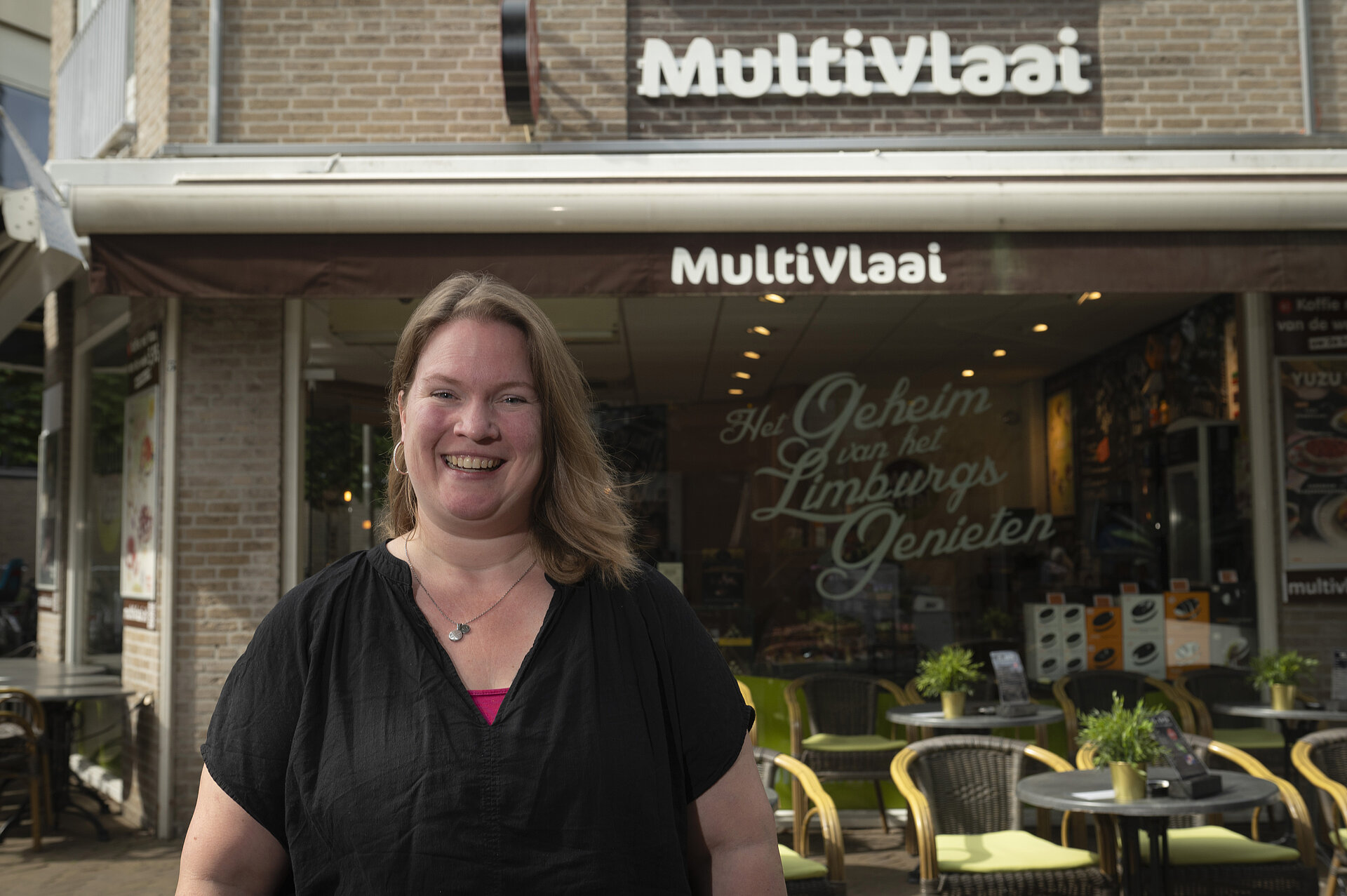 Sinds een jaar is ze de nieuwe eigenaresse van Multi Vlaai Tilburg. De goedlachse Kim Smulders is blij met het goede contact tussen de ondernemers op de Oude Markt. “We lopen gemakkelijk bij elkaar binnen. En het is fijn dat we onze terrassen en dit straatje samen schoonhouden.” Kim zit met haar zaak op de hoek. Dat zorgt ook voor extra uitdaging.