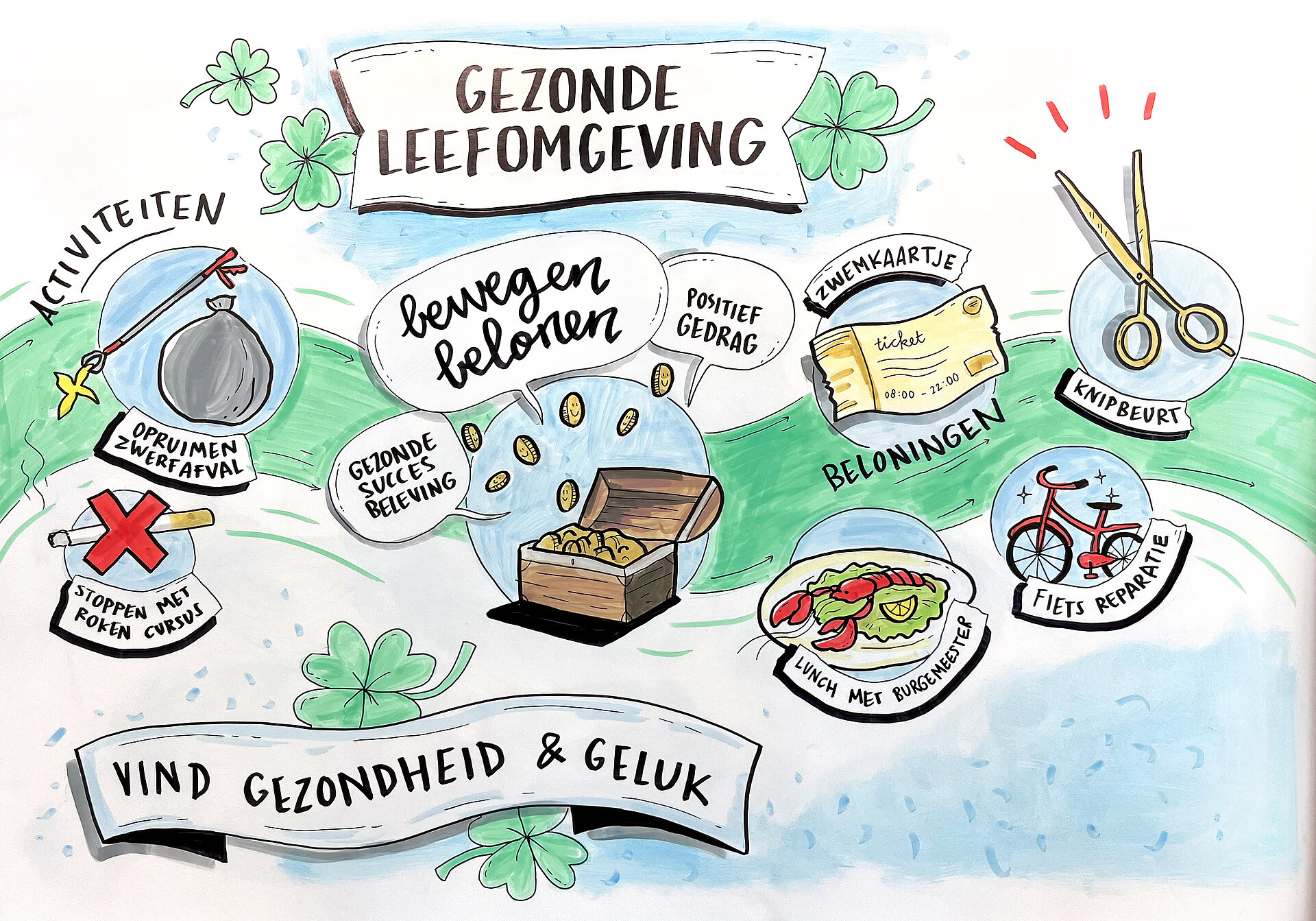 “Beloningen zoals een lunch met de burgemeester, gratis band plakken, zwemkaartje, etc. Deze kunnen verdiend worden door ‘gezond gedrag’, zoals je inzetten als vrijwilliger, volgen cursus stoppen met roken, boodschappen doen voor buurvrouw, etc. Streven is te starten met 50 ‘verdieningen’ en 50 beloningen. Het fascinerende aan dit concept is dat het er allemaal al is. Enige wat we moeten doen is dat mensen JA zeggen. Kortom, wie wil?”