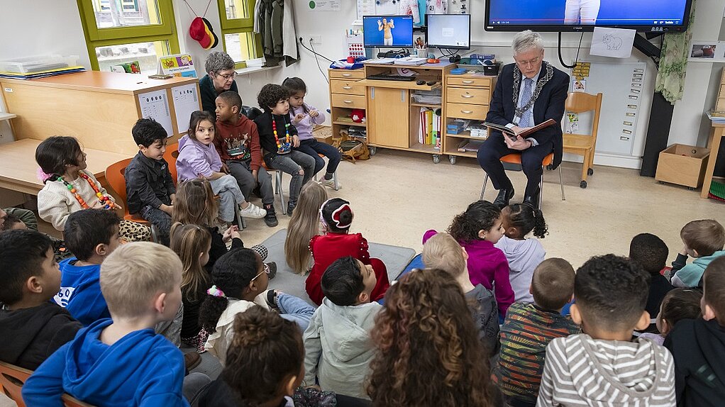 Bij de eerste kleuter(taal)klas, een samenwerking tussen De Sleutel en de Stelaertshoeve, las de burgemeester voor aan een enthousiaste groep kinderen. Vervolgens bracht hij een bezoek aan de Taalschool, waar leerlingen met uiteenlopende taalachtergronden, zoals Chinees, Somalisch en Pools, hard werken aan hun Nederlands. Zowel in de kleuterklas als op de Taalschool zitten ook leerlingen die in onze opvanglocaties wonen, verspreid over de gemeente. Hun vooruitgang is indrukwekkend en bewijst hoe waardevol dit onderwijs is. En daaruit blijkt maar weer dat voorlezen niet alleen leuk is, maar ook een goed middel om kinderen te helpen groeien, de taal te leren en hun inlevingsvermogen te versterken. De taalklassen zijn erop gericht dat de kinderen binnen 2 jaar Nederlands leren als tweede taal. Daarna stromen zij bij voorkeur door naar een reguliere school in het primair of voortgezet onderwijs.