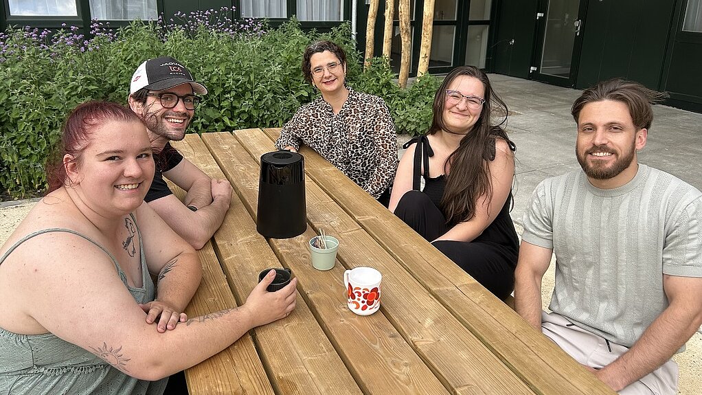 Hanan El Bannouhi zit met een groepje jonge mensen aan een picknicktafel op de binnenplaats van het Bloemkwartier. De sociaal werker van ContourdeTwern heeft de jongeren bij elkaar geroepen, zodat ze kunnen vertellen over het wonen op deze bijzondere plek. Al gauw komen ook andere huurders erbij, zoals Denise, die op weg was naar de gezamenlijke wasmachines. Hanan is de community builder van het Bloemkwartier. “Ik ben er om mensen bij elkaar te brengen”, zegt ze. Dat begon al met het een openingsfeest in mei, waar verschillende bewoners voor het eerst een gesprekje met elkaar aanknoopten. “Dat was echt een ijsbreker”, zegt coach Roman van Hamond van Refugeeteam, dat nieuwe Nederlanders helpt hun weg te vinden in de maatschappij. Hanan en Roman zitten samen met vertegenwoordigers van andere organisaties in het projectteam, bij wie bewoners terecht kunnen met vragen.
