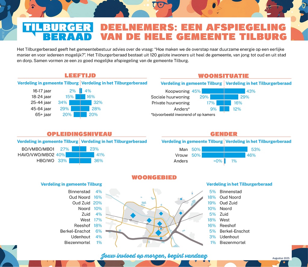 De 120 deelnemers zijn ingeloot op basis van een aantal criteria. Samen vormen zij een goede afspiegeling van onze gemeente: jongeren, ouderen, mensen uit verschillende wijken en dorpen, met uiteenlopende achtergronden en opleidingsniveaus. De komende weken gaan deze inwoners samen adviezen formuleren voor het gemeentebestuur, over hoe Tilburg op een eerlijke manier kan verduurzamen.